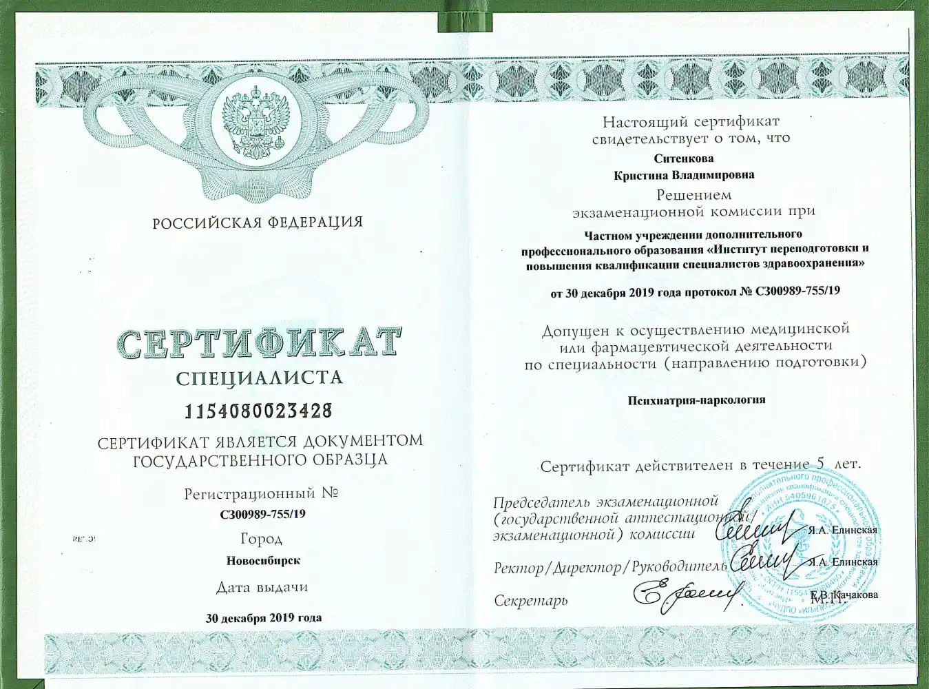 Психиатр-нарколог Ситенкова Кристина Владимировна